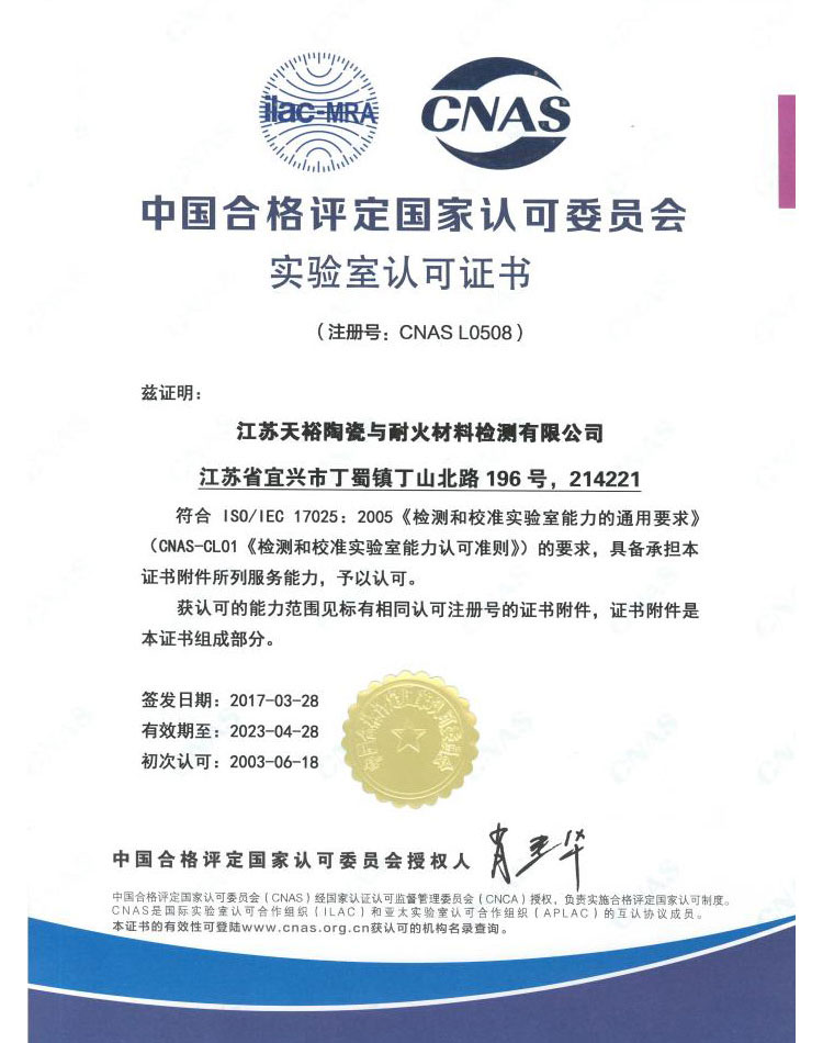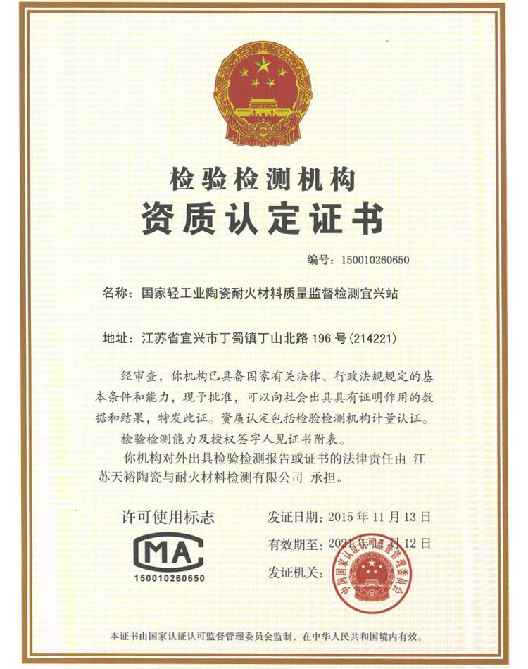 輕工業(yè)陶瓷耐火材料質(zhì)量監(jiān)督檢測(cè)宜興站(江蘇天裕陶瓷與耐火材料檢測(cè)有限公司),是江蘇省內(nèi)的擁有陶瓷與耐火材料兩大系列產(chǎn)品的檢測(cè)站,同時(shí)擁有CMA和CNAS雙重資質(zhì)證書(shū),擁有包括高溫抗折儀、平板法導(dǎo)熱儀、荷重軟化儀等的科研檢測(cè)設(shè)備設(shè)施60多臺(tái)/套,可以授權(quán)檢驗(yàn)范圍包括耐火材料(定型制品、不定型制品、輕質(zhì)保溫等)、建筑陶瓷(陶瓷磚、燒結(jié)瓦等)、日用陶瓷、化工陶瓷、工業(yè)陶瓷及各類陶瓷耐火原材料等。