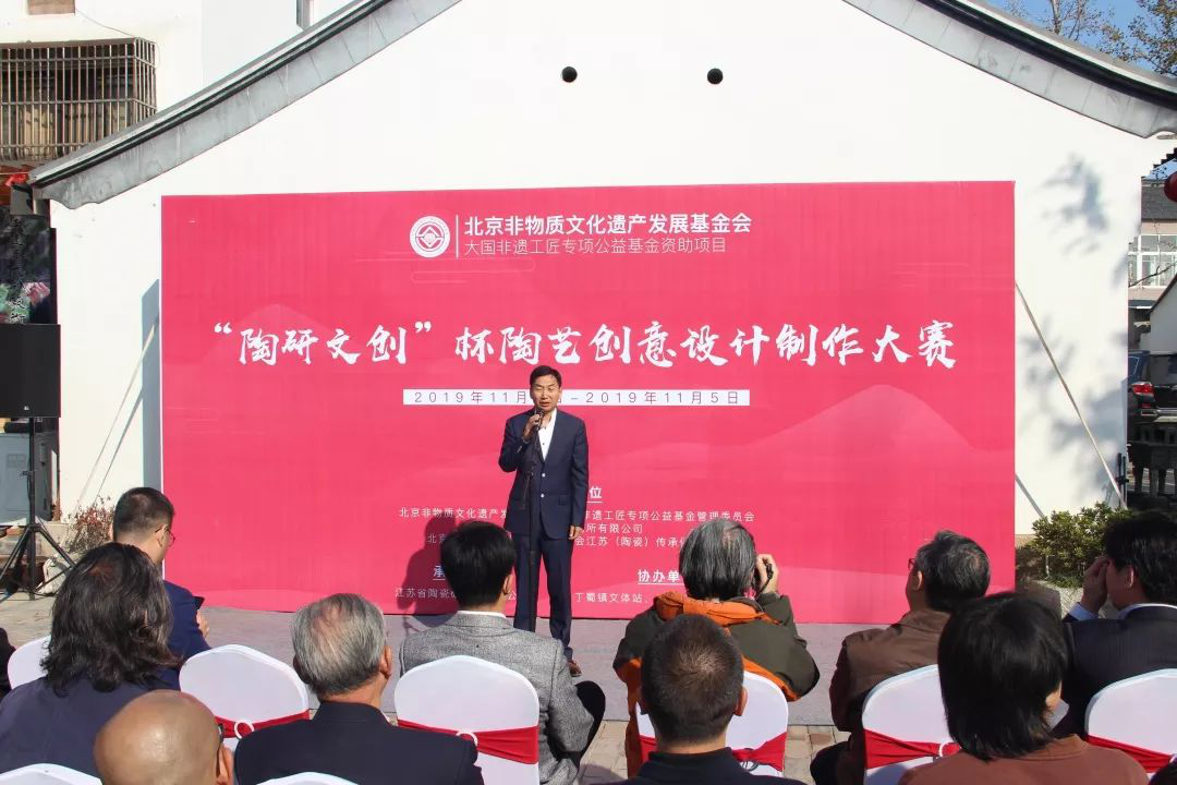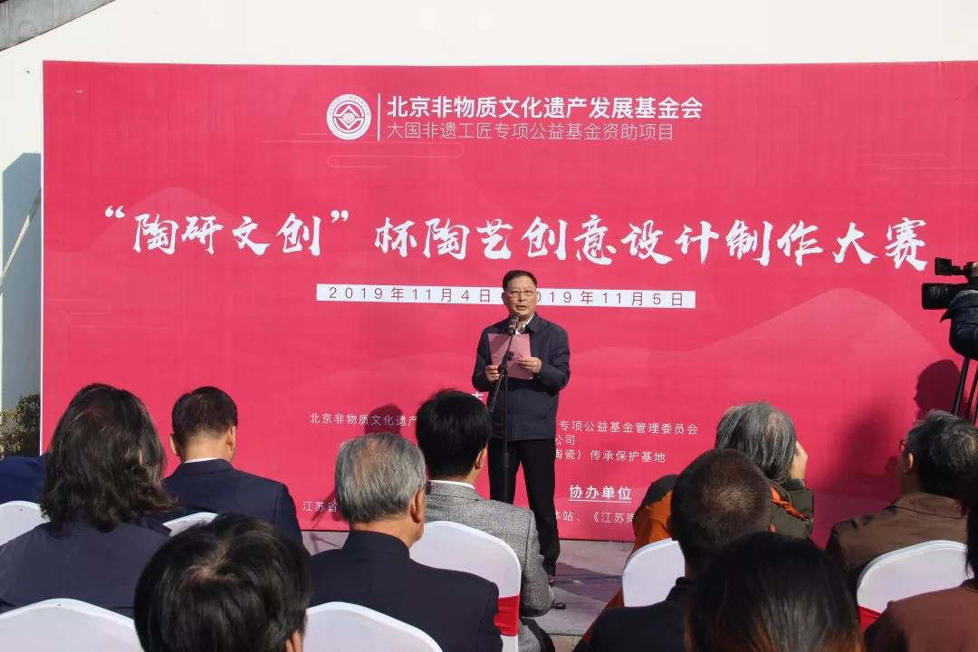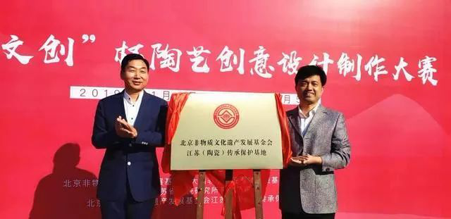 北京非物質文化遺產發展基金會理事長陳四光、宜興市副市長儲紅飆共同為江蘇(陶瓷)傳承保護基地揭牌